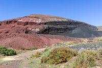 Panoramisch uitzicht op een rood en zwart gekleurde vulkanische rotsformatie in het zuiden van het Canarische eiland Lanzarote, Spanje in de buurt van Playa Blanca met een spaarzame vegetatie op de voorgrond en een blauwe lucht.