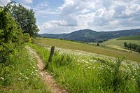 Panoramafoto van het landschap rond Winterberg met wilde bloemenweide en wandelroute, Sauerland, Duitsland