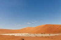 Op de foto zien we een overzicht van de hele vallei, omgeven door oranje en rode zandduinen. De vallei zelf is wit van de opgedroogde kalk en erin staan dode bomen. De lucht is hemelsblauw met een paar hele kleine wolkjes.