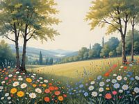 Een betoverend landelijk landschap met glooiende heuvels, eindeloze velden en schilderachtige bomenrijen.