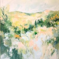 Een zachte stroom van kleur omarmt de glooiende heuvels, waar het licht delicaat over het landschap danst. De krachtige groene tinten smelten samen met pastelkleurige accenten en geven het landschap een dromerige lichtheid. Hier lijkt de natuur te pulseren in harmonieuze eenheid, terwijl elke penseelstreek de rust en bloei van het leven viert.