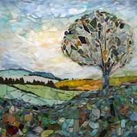 Landschap van scherven glas, porselein, aardewerk en acrylverf