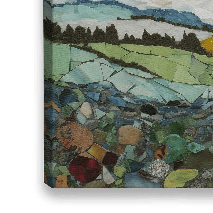 Landschap van scherven glas, porselein, aardewerk en acrylverf