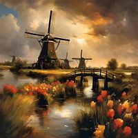 Landschap van tulpen en molens in Nederland
