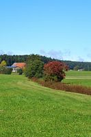 De foto toont een boerderij op de achtergrond, met weilanden, struiken en bossen.