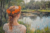 Landschap - Meisje met bloemen. Panorama uitzicht meisje met bloemen. Impressionisme portret schilderij van vrouw bij een uitzicht op een landschap.