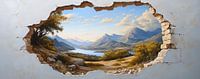 Landschap - Dit landschapsschilderij geeft een doorkijk weer, omlijst door een rotsachtige opening in een muur, die uitkijkt op een sereen bergmeer omringd door majestueuze bergen en een heldere hemel.