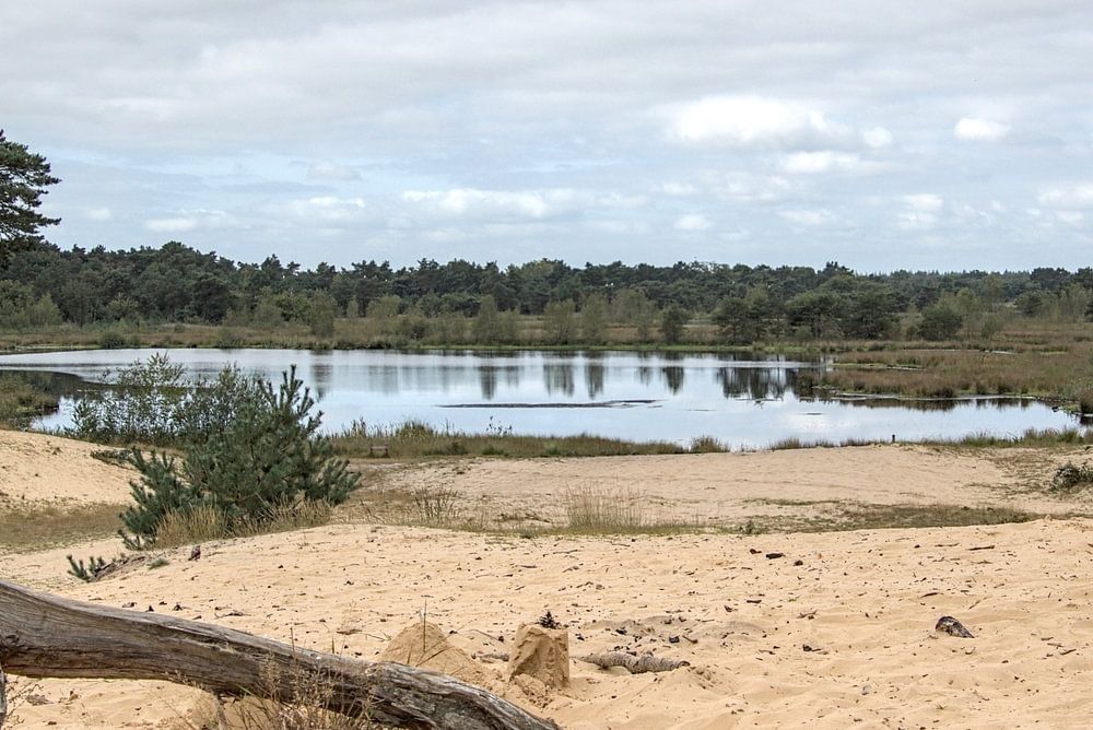 Een mooi uitzicht op Kampina Boxtel. Op de achtergrond een weerspiegeling van de bomen in het water. Het wolkendek ziet er indrukwekkend uit. De boomstam zorgt voor een goede diepte in de foto.