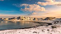 Landschappelijk uitzicht over het zandstrand bij het dorp Fredvang tijdens een wandeling in Ytresand op de Lofoten eilanden archipel in Noorwegen in gouden zonlicht op heldere winterdag