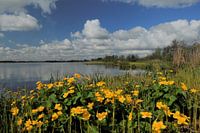 De gele dotterbloemen bloeien in het moeras in de lente. De samenhang met fraaie wolkenluchten maken het tot een heel pittoresk panorama.