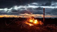 Romantisch kampvuur in de avond aan de IJslandse kust