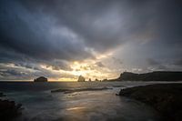 Pointe des Chateau met uitzicht op Pointes des colibris en de baai met zandstrand. Lange belichting met uitzicht op de zee en de zonsopgang. Dramatische wolken zijn te vinden op de zuidoostelijke punt op Guadeloupe. Een eiland van de Franse Antillen in het Caribisch gebied.