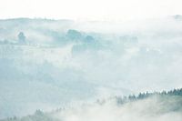 Een mistige ochtend in de heuvels van de Ardennen, waarin je de verschillende lagen ziet terugkomen.