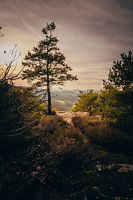 Deze foto is genomen in het Pfälzerwald in Duitsland. Het uitzicht of beter gezegd de rots heet de Honigfelsen en laat vanuit een gezichtspunt een prachtig herfstlandschap zien in het bos met zonsondergang.