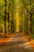 Landweg door een beukenbos tijdens een mooie herfstdag in Gelderland. Langs het pad groeien beukenbomen in een rij.