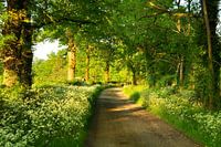 Een foto van een landweg in Frankrijk. Over het weggetje hangen de takken van oude eikenbomen die aan weerskanten van de weg staan. Tussen de bomen staat Fluitenkruid uitbundig te bloeien. De lage avondzon strooit het licht tussen de bomen over de wilde bloemen uit. Mijn favoriete plek om een avondwandeling te maken. Een uitnodigend beeld waarbij je haast de vogels hoort fluiten en de bijen hoort zoemen.
