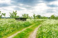 Landelijk tafereel van een verlaten landweggetje tussen het frisse groen van de volle begroeiing van bomen, gras en onkruid waarin een schuurtje verscholen staat.