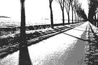 Het fietspad tussen Purmerend en Monnickendam. Ik wilde er een harde en koude zwartwitprent van maken, hoewel het op het moment van fotograferen warm en zonnig was. Een beeld als dit had ik al heel lang in gedachten. Ik zocht ook al lang naar een lange straat of weg zonder verkeer, omgeven door bomen om het juiste perspectief te…