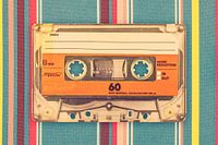 Vintage oranje muziekcassette op jaren zeventig gestreepte achtergrond