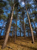 vanaf de grond zo de hoogte in met de bomen. Mooie blauwe achtergrond op de groene bladeren van de dennebomen