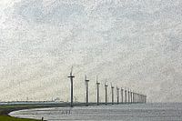 Langs de rand van de lange, lange oever van een grote waterplas zijn talloze windmolens geplaatst. Ze bewegen mooi met de bocht van de oever mee. Het land is plat en vlak, dus er zal best veel wind waaien. Volgens mij kwam ik ze tegen op weg naar een van de Nederlandse schiereilanden. Een fascinerend beeld. Het horizontale landschap waar in symmetrische, verticale lijnen de windmolens naar de hemel reiken.