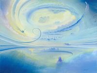De lucht boven de zee is bezaaid met wolken die in verschillende vormen en texturen verschijnen. Een kenmerkende band van wolken strekt zich uit over de horizon en geeft het beeld een zekere symmetrie. Het spel van de wolken creëert een gevoel van uitgestrektheid en oneindigheid, waarbij de horizon tot in het oneindige lijkt te reiken.