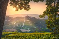 Langhe wijngaarden, Castiglione Falletto dorp en een boom als frame bij zonsondergang. Unesco-gebied, regio Piemonte, Noord-Italië Europa.