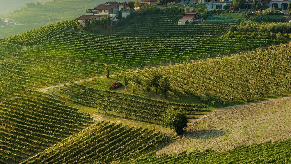 Over "Langhe, wijngaarden bij zonsopgang nabij Neive, Piemonte, Italië"