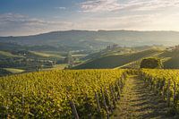 Panoramisch uitzicht op de wijngaarden van Langhe en kasteel Grinzane Cavour op de achtergrond, Unesco Werelderfgoed, regio Piemonte, Italië