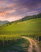 Langhe wijngaarden bij zonsondergang, Barolo en La Morra dorpen op de achtergrond, Unesco Werelderfgoed, regio Piemonte. Italië, Europa.
