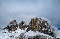 De indrukwekkende berg Langkofel of Sassolungo in de Italiaanse Dolomieten bedekt met sneeuw tijdens een lentemorgen in de Italiaanse Alpen.