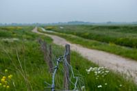 Dit werk is een atmosferisch landschapsbeeld dat de rust van het Nederlandse polderlandschap vastlegt op een mistige dag. De compositie wordt gedomineerd door een sterke diagonaal: een zandpad slingert de zachte verte in, omgeven door heldergroene velden. De focus ligt op de onmiddellijke voorgrond, waar een stuk ruw, oud prikkeldraad…