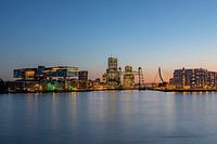 De Nieuwe Maas, de natte grens tussen Rotterdam en Rotterdam Zuid. Vanaf de Maasboulevard kijk je naar de Koningshaven, rechts het Noordereiland en links het 'ex Unilever kantoorgebouw wat "de Brug" wordt genoemd. De Koningshavenbrug a.k.a. de Hef en de Erasmusbrug tekenen zich hier af tegen het laatste licht van de eerste mooie dag in…