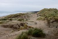 Een rustig pad slingert zich door de met helmgras begroeide duinen, begeleid door een verweerde houten afrastering. De wind heeft sporen getrokken in het zand, terwijl in de verte de kustlijn en een paar wandelaars zichtbaar zijn. De zachte kleuren en het grijze licht roepen een gevoel van stilte en ruimte op - en typisch beeld van de…