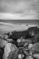 Deze zwart-wit foto van het strand van Oostende vangt de ruwe schoonheid van de Belgische kust. De massieve golfbrekers en rotsen aan zee vormen een sterk contrast met het zachte ritme van de golven en de uitgestrekte Noordzee. Op de achtergrond strekt het zandstrand van Oostende zich uit, terwijl meeuwen langs de waterlijn…