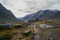 Een smal pad snijdt door het landschap en leidt het oog het dal in. Rotsen, mos en laag groeiend groen vormen een ruwe voorgrond, terwijl de bergen aan weerszijden het beeld dragen. Hun lijnen sluiten zich langzaam om de vallei en versterken het gevoel van schaal en afstand.