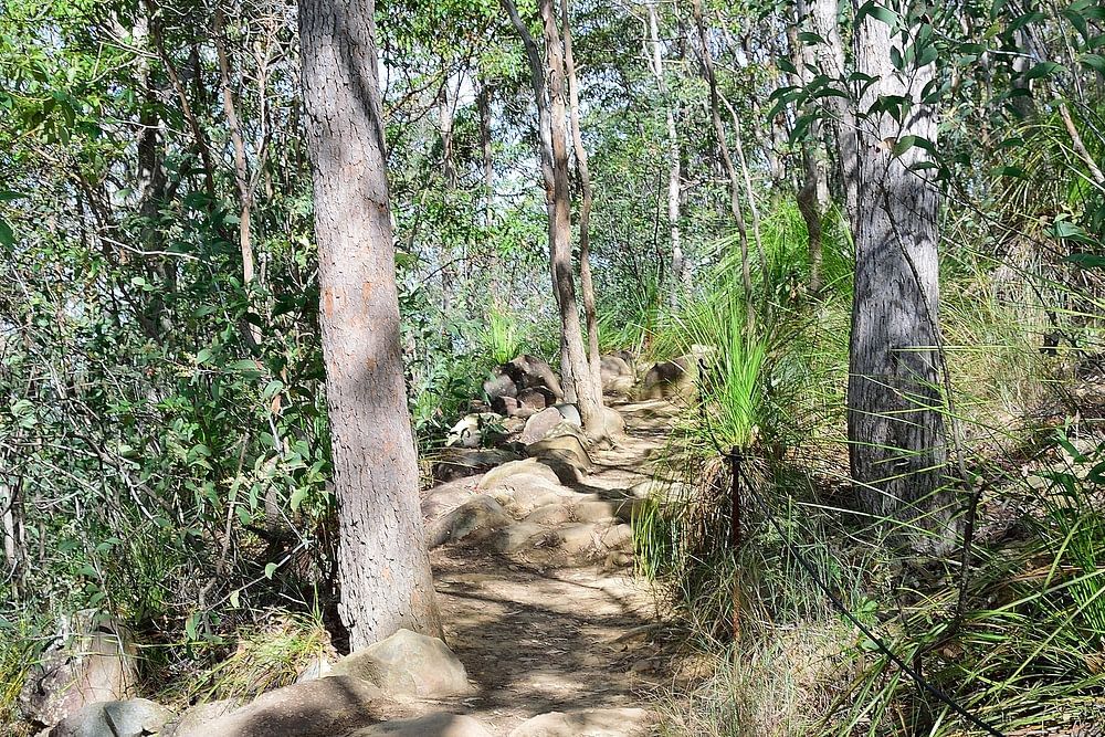 Langzaam maar zeker kom je er tijdens het beklimmen van de Ngungun berg in de Glass House Mountains, Queensland, Australië. Mooie maar steile klim over een rotsachtig pad.