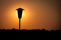 De zon achter een lantaarnpaal. Het lijkt wel de omgekeerde wereld.