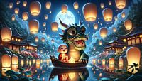 Als de maan aan de hemel staat en lantaarns de tempeltuin baden in een zee van licht, begint een nachtelijk avontuur. Een jonge monnik vaart zachtjes over kalme wateren in een drakenboot. De draak die de boot leidt ontbloot zijn tanden in een brede glimlach, alsof hij de hemelse parade van lantaarns begroet. Omringd door traditionele Chinese paviljoens die weerspiegeld worden in het water, creëert dit tafereel een buitenaardse en rustgevende sfeer. De illustratie is een meesterwerk van cartoon en verbeeldt de mystieke verbinding tussen mens en mythisch wezen in een levendige viering van licht.