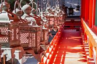 Lantaarns hangend bij een Japanse tempel in het tempelstadje Nara, nabij Kyoto en Osaka. Oranje geschilderde tempel en metalen lantaarns.