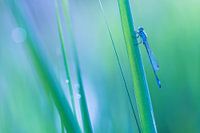 Ochtend opnamen van een Lantaarntje (Ischnura elegans) op riet met dauw. De zon weerspiegelt op de dauwdruppels en zorgt voor een serene uitstraling.