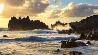 Golven beuken tegen het lavagesteente tijdens zonsondergang.