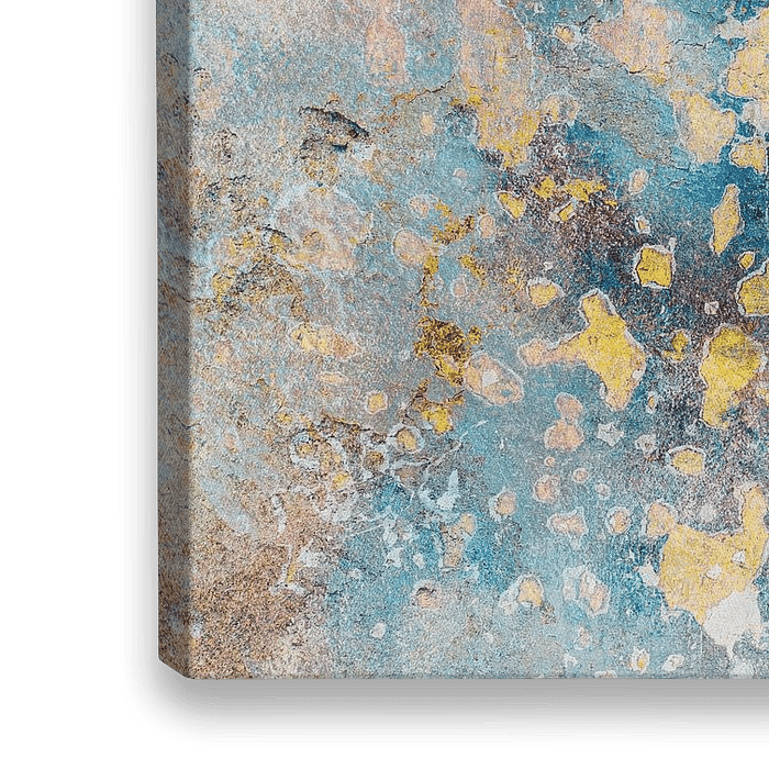 Ontdek de rauwe schoonheid van vergankelijkheid in deze unieke abstracte fotocollage, geïnspireerd door verweerde muren en pleisterwerk uit het landschap van Lanzarote. Deze kunstzinnige collage combineert realistische texturen met dromerige overvloei-technieken tot een schilderachtig geheel van blauw, goud, geel en roze pasteltinten.