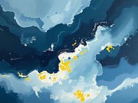 Dit abstracte kunstwerk heeft een dynamische compositie van diepblauw, lichter hemelsblauw en vleugjes wit, die doen denken aan wervelende wolken of oceaanstromingen. Spatten van levendig geel doorspekken de scène en voegen een opvallend contrast en een gevoel van energieke beweging toe, alsof er goudstof wordt gestrooid. De texturen…