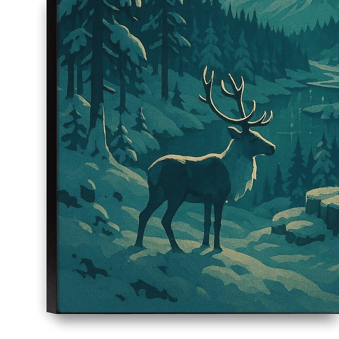 Deze kunstdruk van Lapland Finland verbeeldt de magie van de Arctische wildernis onder het gloeiende noorderlicht. Met besneeuwde dennenbomen, een majestueuze bergtop en een rendier op de voorgrond, belichaamt deze reisposter de stille schoonheid van het hoge noorden van Finland. Het dansende noorderlicht verlicht de hemel in groene…