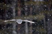 Laplanduil (Strix nebulosa) in vlucht tijdens sneeuwstorm, Finland.