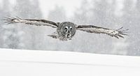 Laplanduil (Strix nebulosa) in vlucht tijdens sneeuwstorm, Finland.