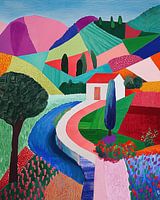 "Lappendekenvallei" toont een levendige en vreugdevolle weergave van een landelijk landschap, waar de heuvels en velden tot leven worden gebracht door een caleidoscoop van kleuren en patronen. De speelse, geometrische compositie vangt de essentie van het platteland met een moderne twist en biedt een frisse kijk op natuurlijke schoonheid. Het kronkelende pad door het tafereel nodigt kijkers uit om de harmonie te verkennen tussen de levendige, geabstraheerde vormen en de serene eenvoud van het landelijke leven.
