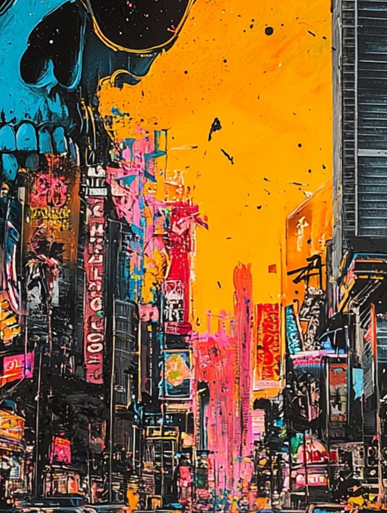 Deze abstract-expressionistische afbeelding van de Las Vegas Strip spat van het doek in felle kleuren: neonroze, citroengeel, knalblauw en vlammend oranje vermengen zich in explosieve beweging. Midden in de compositie doemt een schedel op, half verborgen in de chaos – een krachtig symbool van vergankelijkheid in een wereld vol glitter en verleiding. De schedel contrasteert scherp met de bruisende kleuren, als een fluistering van stilte in de schreeuwende pracht.