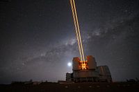 Vier lasers schijnen in de hemel op de VLT telescope van de Europese Zuidelijke Sterrenwacht. De lasers dienen om de turbulentie in de atmosfeer te meten, zodat die m.b.v. een deformeerbare spiegel kan worden gecorrigeerd. Daarmee worden de beelden van de telescoop scherper dan de Hubble Space Telescope.